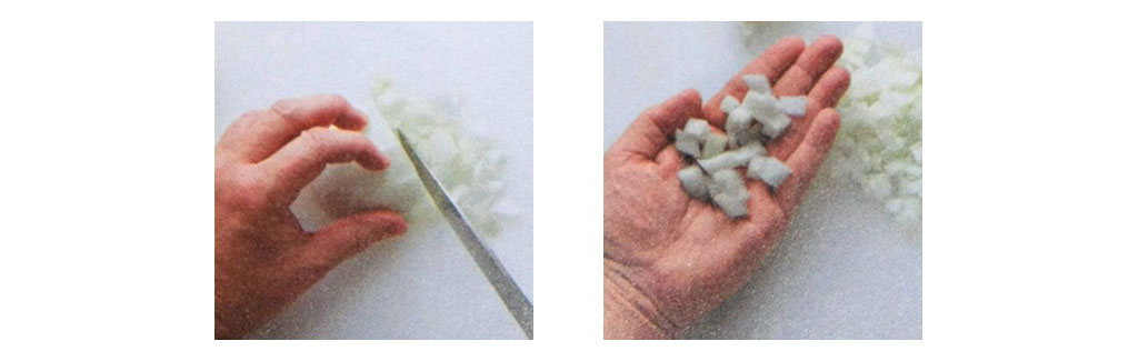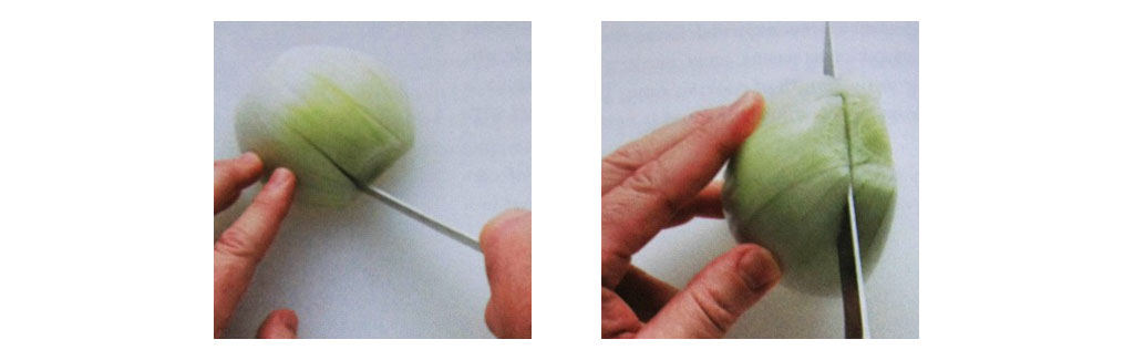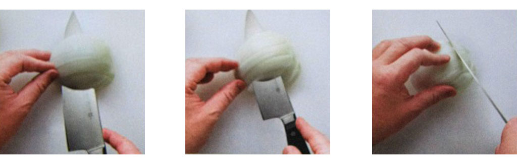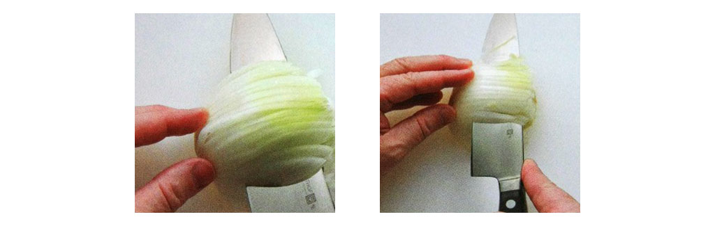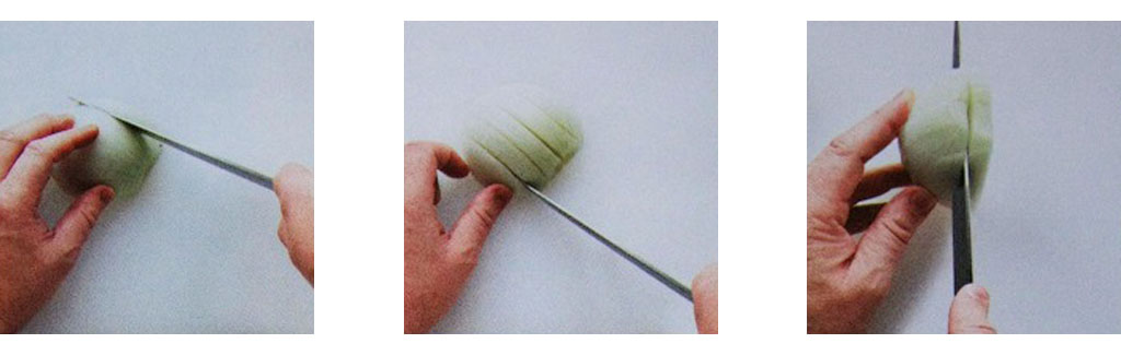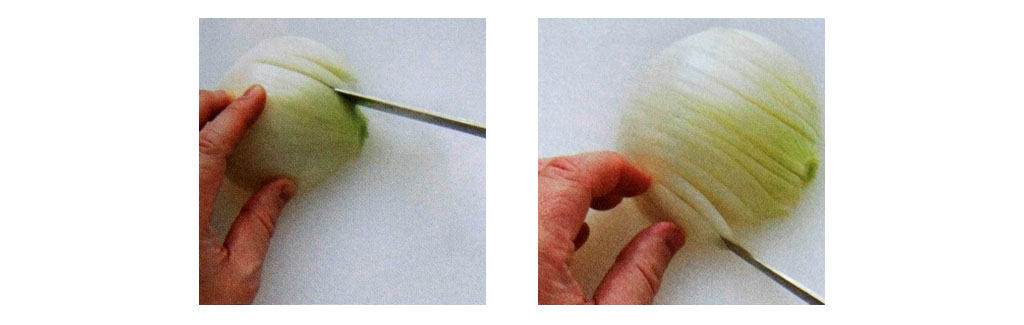 Эта техника применяется к репчатому луку и луку шалот и позволяет нарезать луковицу очень очень мелко.