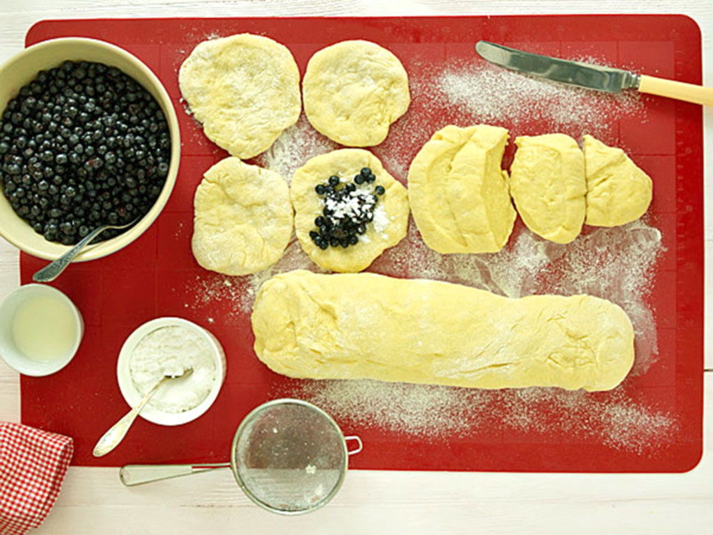 4. В центр кусков теста с диаметром около 12-14 см выложить часть ягод, посыпать их сахарной пудрой, сложить и сформировать булочку.