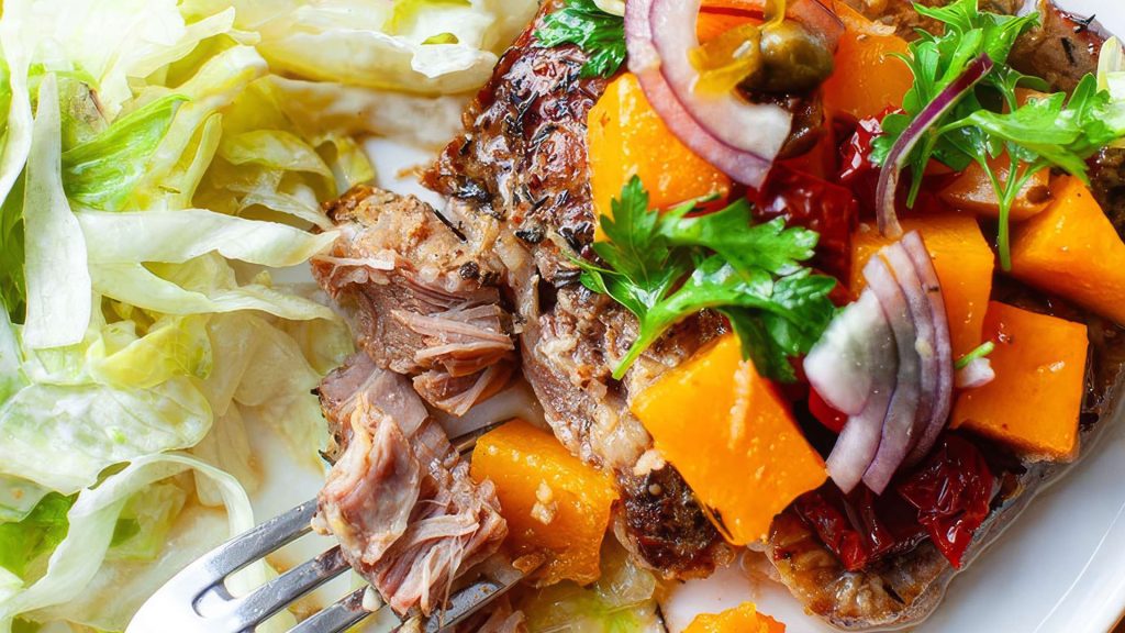 Сочные внутри и румяные снаружи куски свиной шеи, запечённые в духовке с добавлением тыквы и вяленых помидоров. Тыкву можно заменить бататом. Это сытное и ароматное блюдо идеально подходит для осеннего ужина или воскресного обеда. Сочетание нежного мяса, сладкой тыквы и насыщенного вкуса вяленых помидоров придаёт блюду особую глубину. Каперсы добавляют пикантности, а соевый соус и вино создают насыщенный соус, который прекрасно сочетается с мясом.