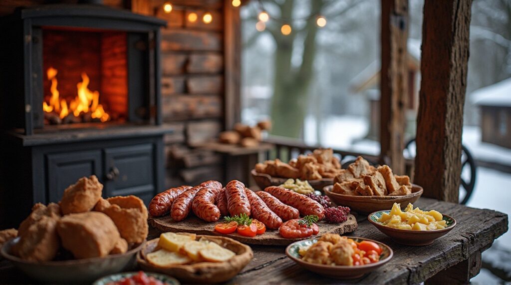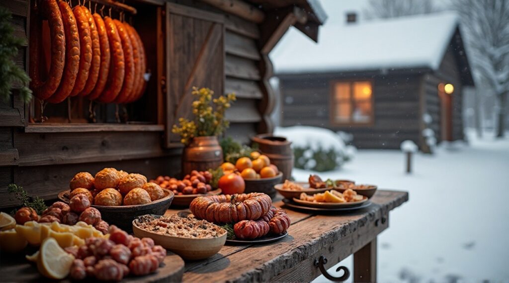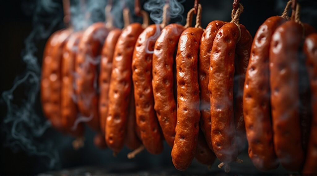 Ароматная деревенская копченая колбаса (Kiełbasa wiejska wędzona) приготовлена по деревенской традиции Польши. Основу составляют мясо и натуральная оболочка, а горячее копчение придаёт насыщенный вкус и характерный аромат. Колбаса отражает аутентичный деревенский характер Малополья и Подкарпатья, где домашнее мясное производство и использование традиционных техник копчения сохраняют культурное и гастрономическое наследие Польши.